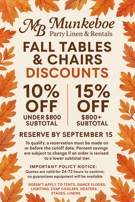 ✅ 15% OFF orders over $800 (tables & chairs only)